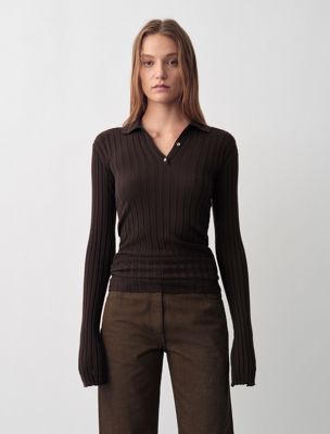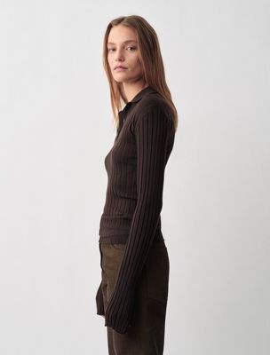 A wide ribbed polo sweater with a figure-defining silhouette. Made from 100% merino wool.