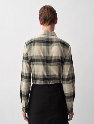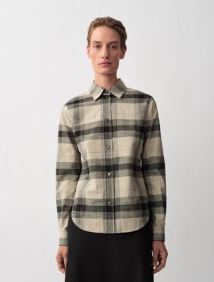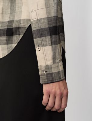 A slim shirt featuring an exclusive check pattern. Faded with a washed, vintage finish. Curved at the hem with a top stitch. Darted at the back and made from 100% cotton.
